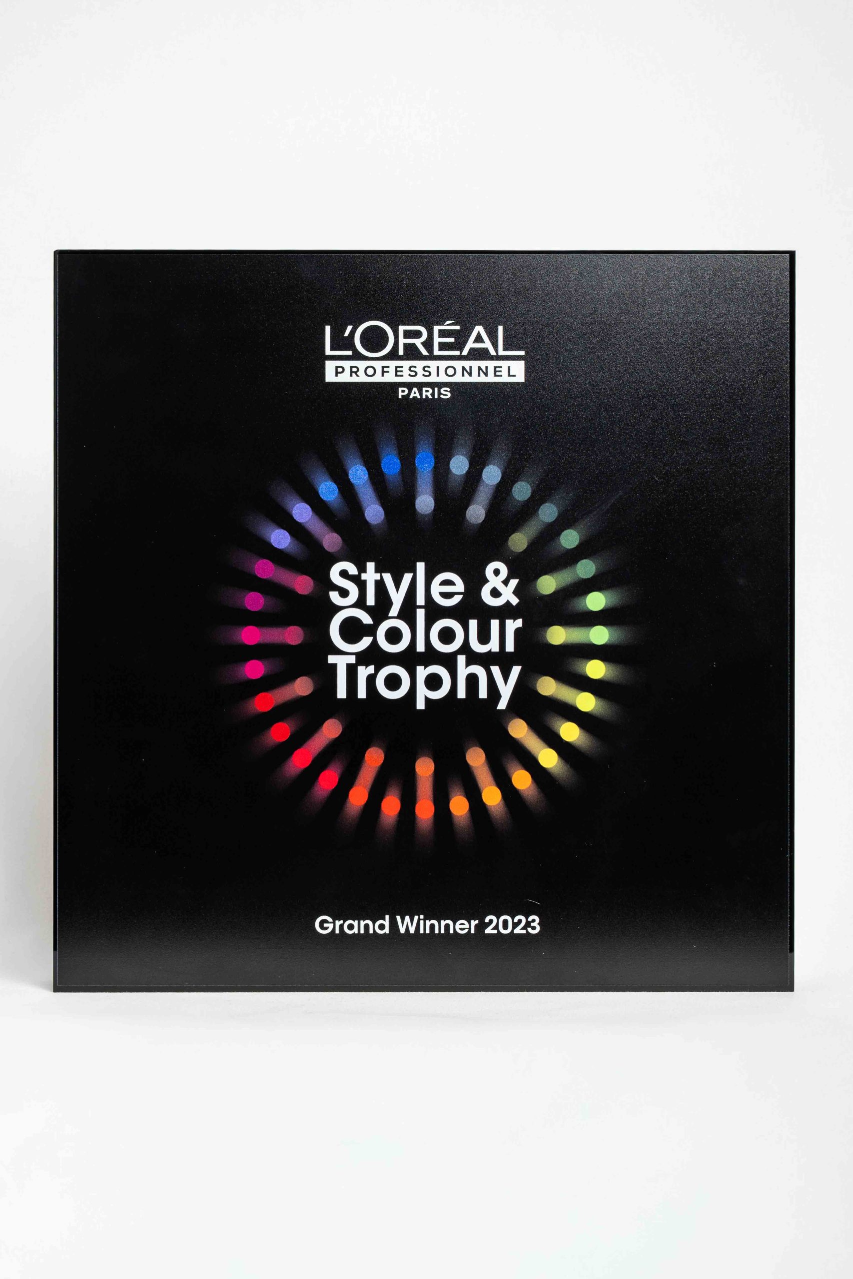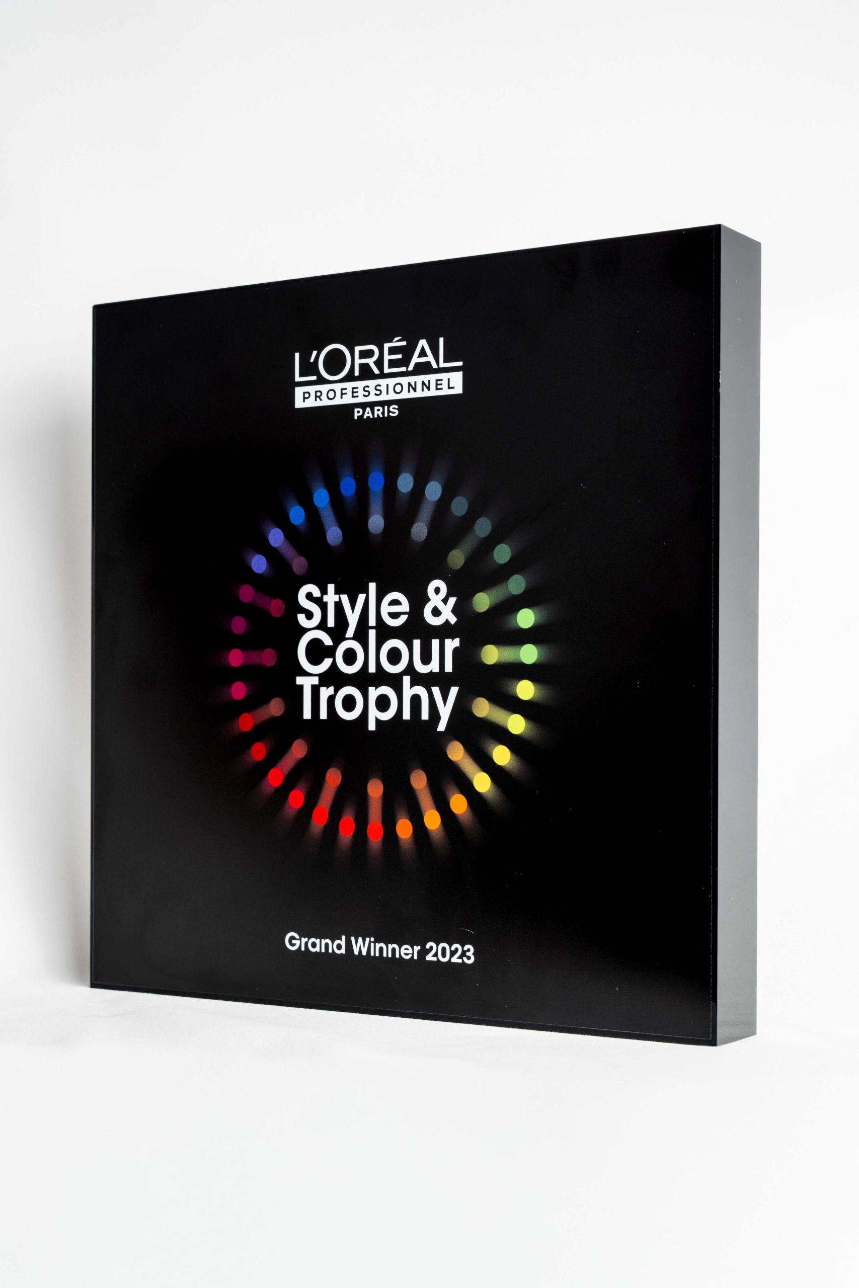 Trophées Concours réalisés sur mesure en plexiglas noir pour sublimer le talent des professionnels coloristes de la coiffure